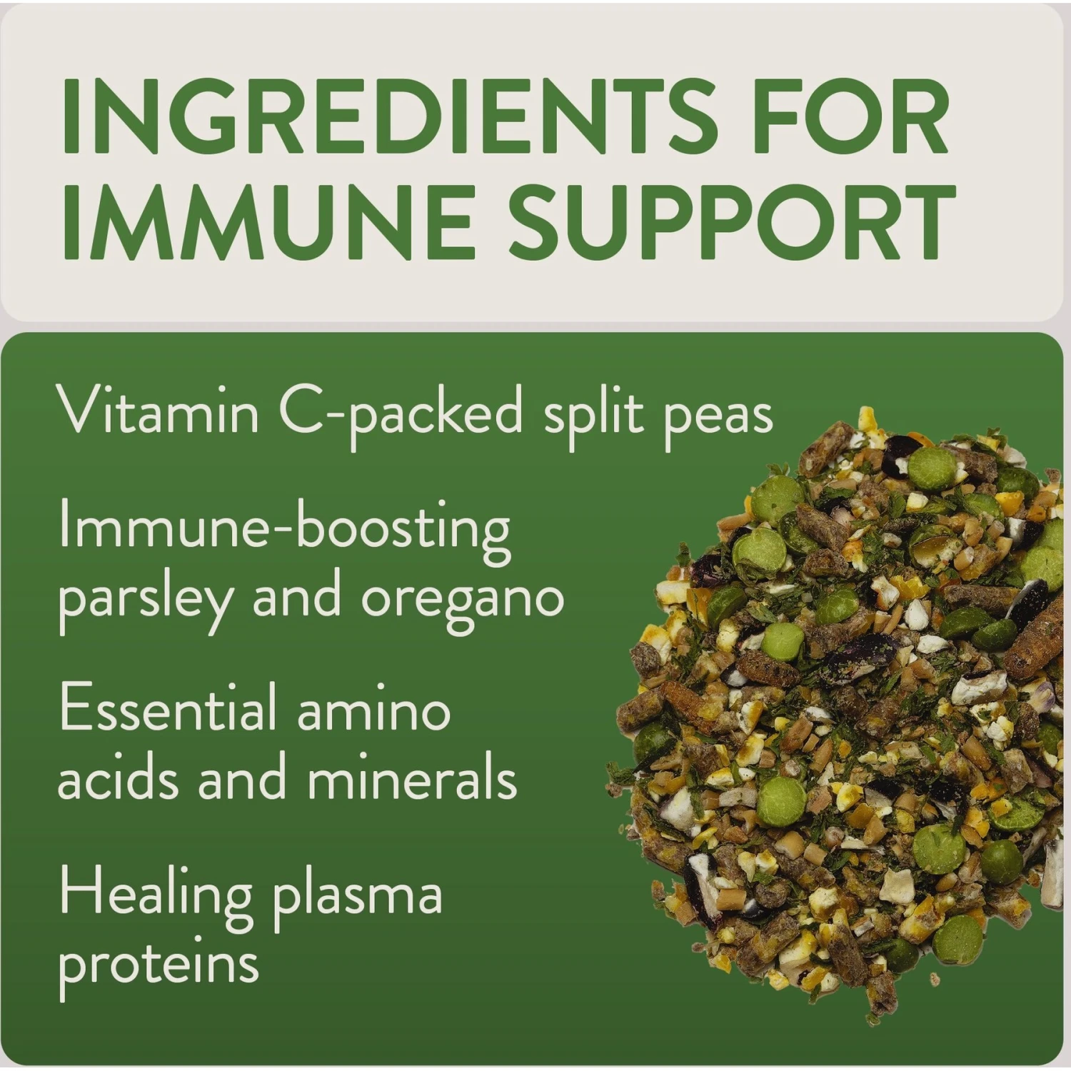- Contains Vitamin C and niacin-rich split peas, immune-supporting parsley and oregano, essential amino acids and minerals, and plasma proteins.