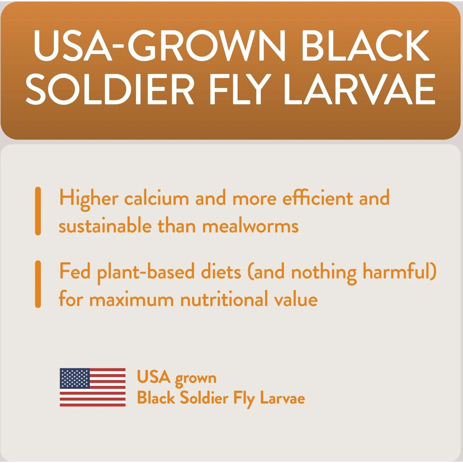 - Made with USA-sourced black soldier fly larvae, which are 50x higher in calcium and more sustainable than mealworms.