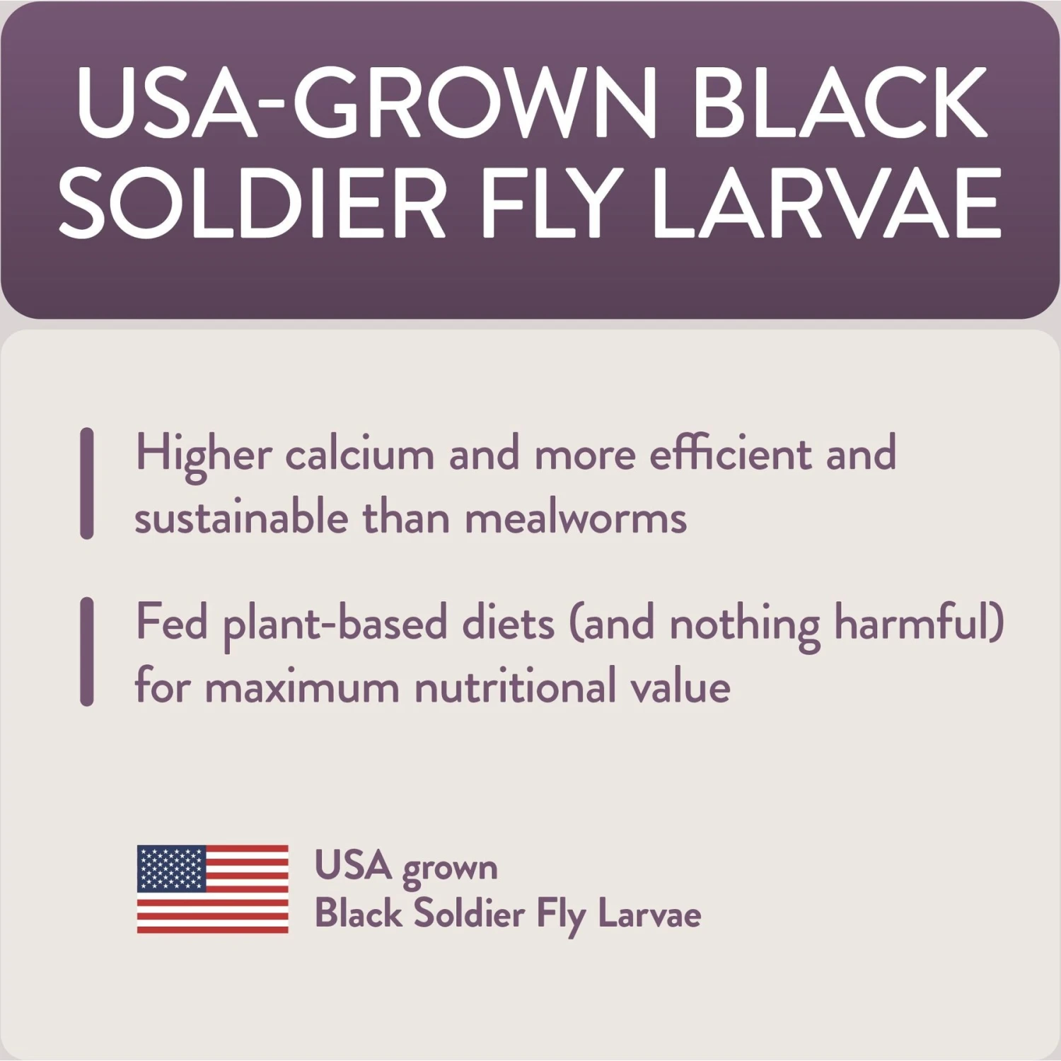 - Made with USA-sourced black soldier fly larvae, packed with protein and calcium that is more sustainable than mealworms.