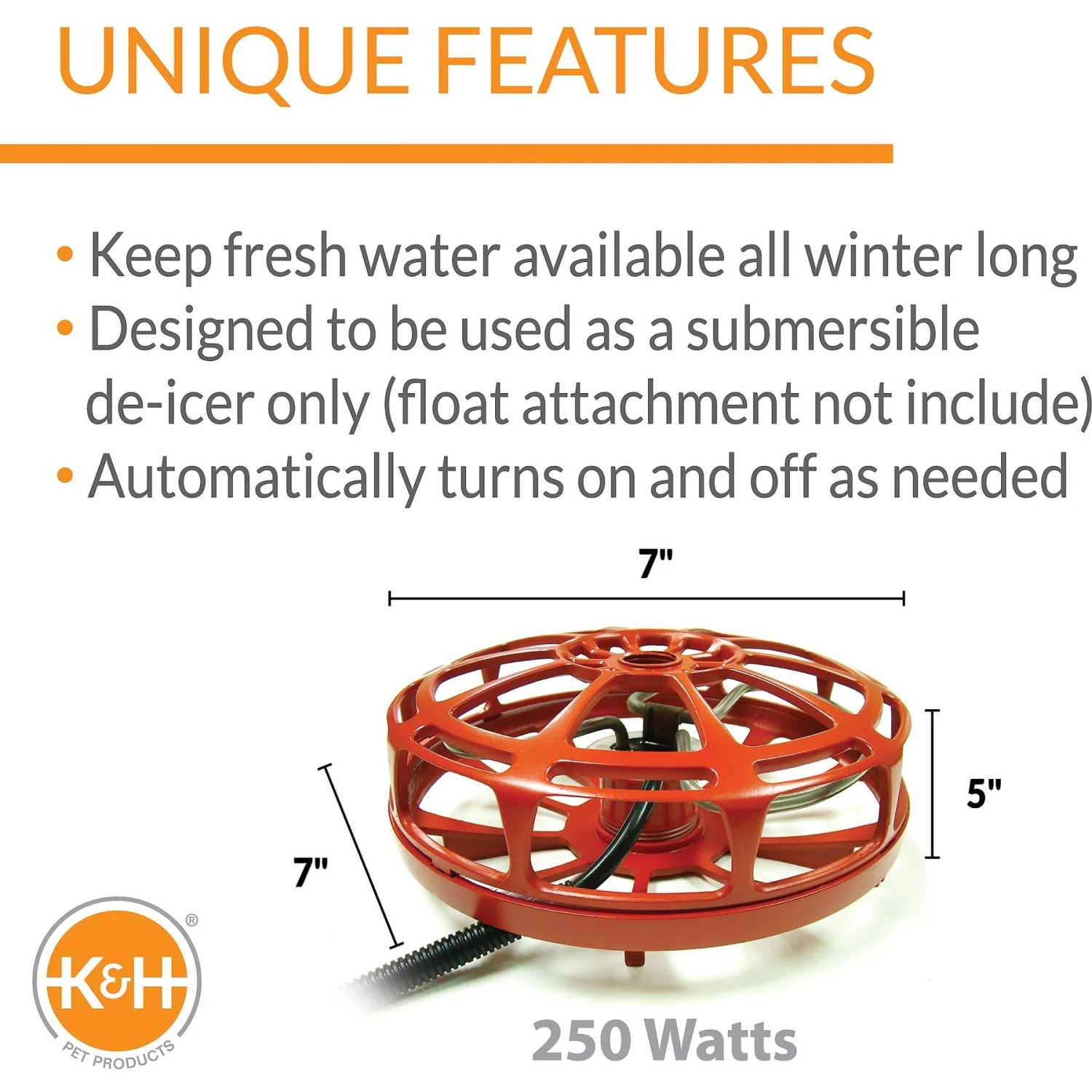 - Keeps water from turning into ice so that dogs, livestock and horses always have a fresh supply.