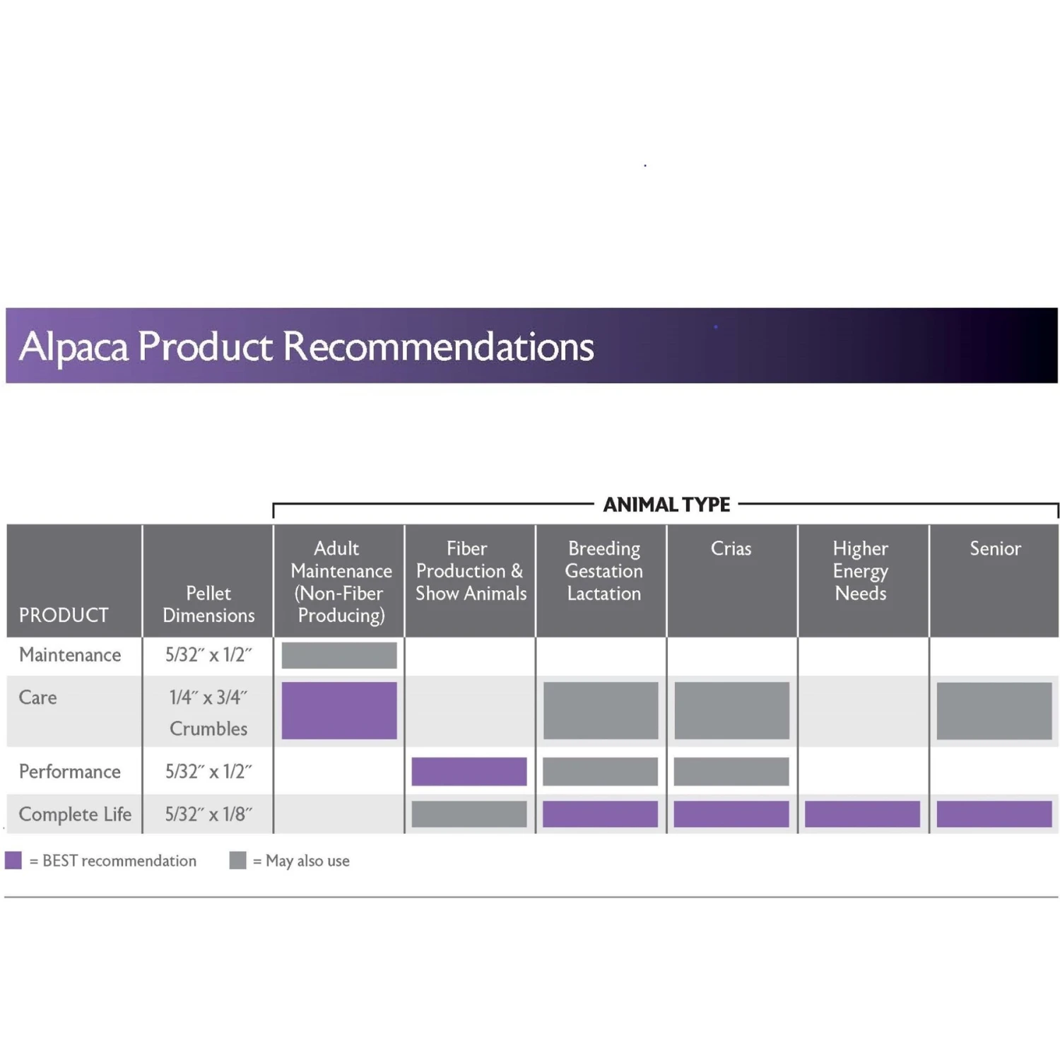 - Formulated for optimal nutrition of growing, gestating, lactating and fiber-producing alpacas.
