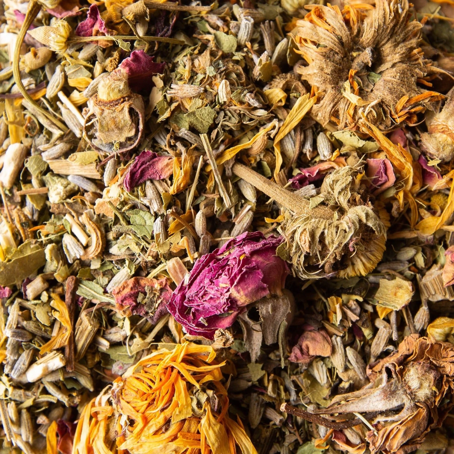 - Organic herb blend includes lemon verbena, calendula, chamomile, echinacea, lavender, lemon balm, spearmint, rosebuds and rose petals.