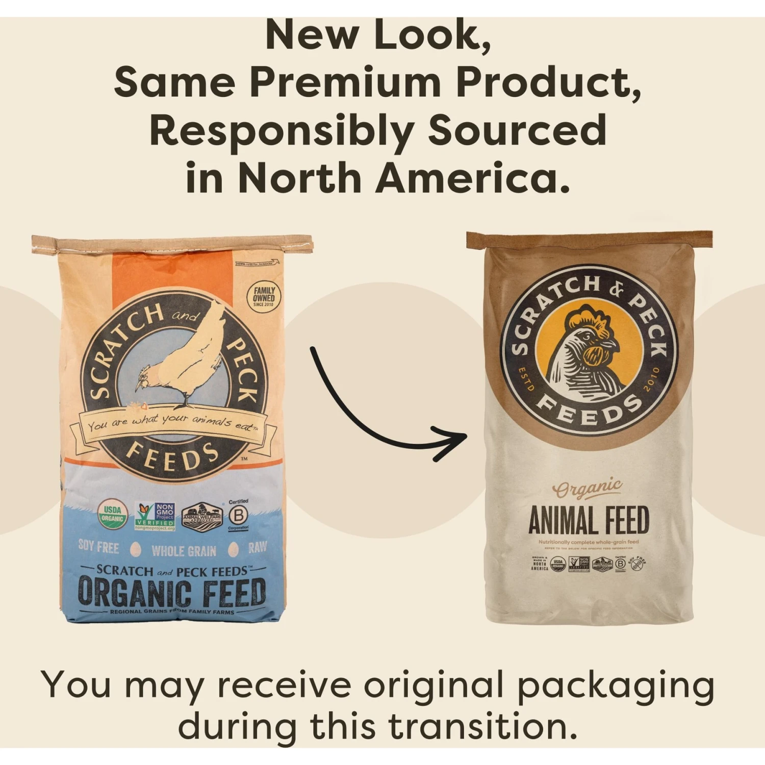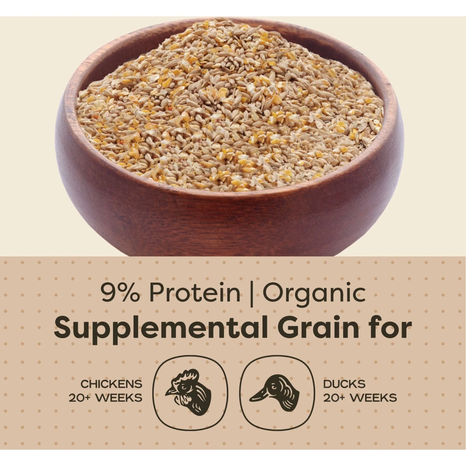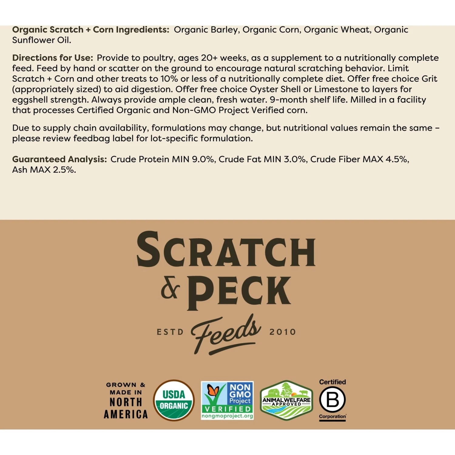 - Organic, non-GMO and soy-free chicken scratch treats with corn.