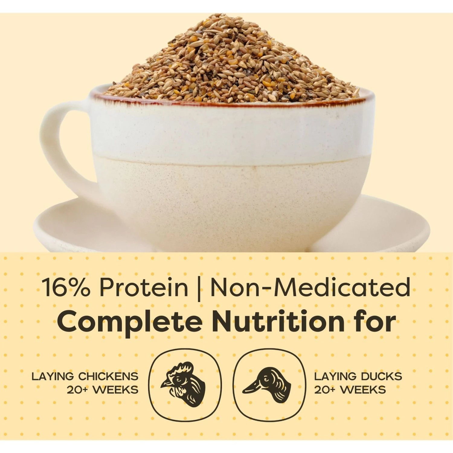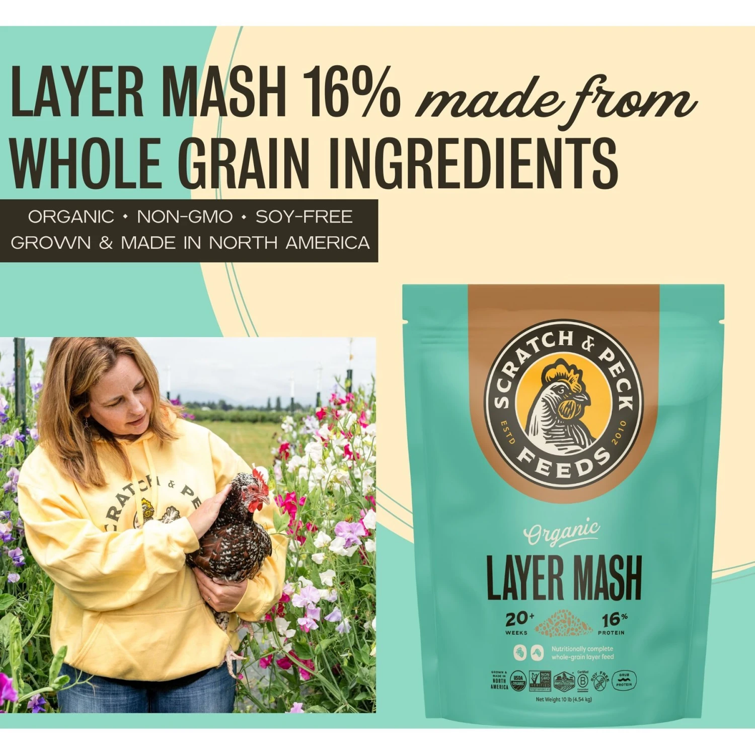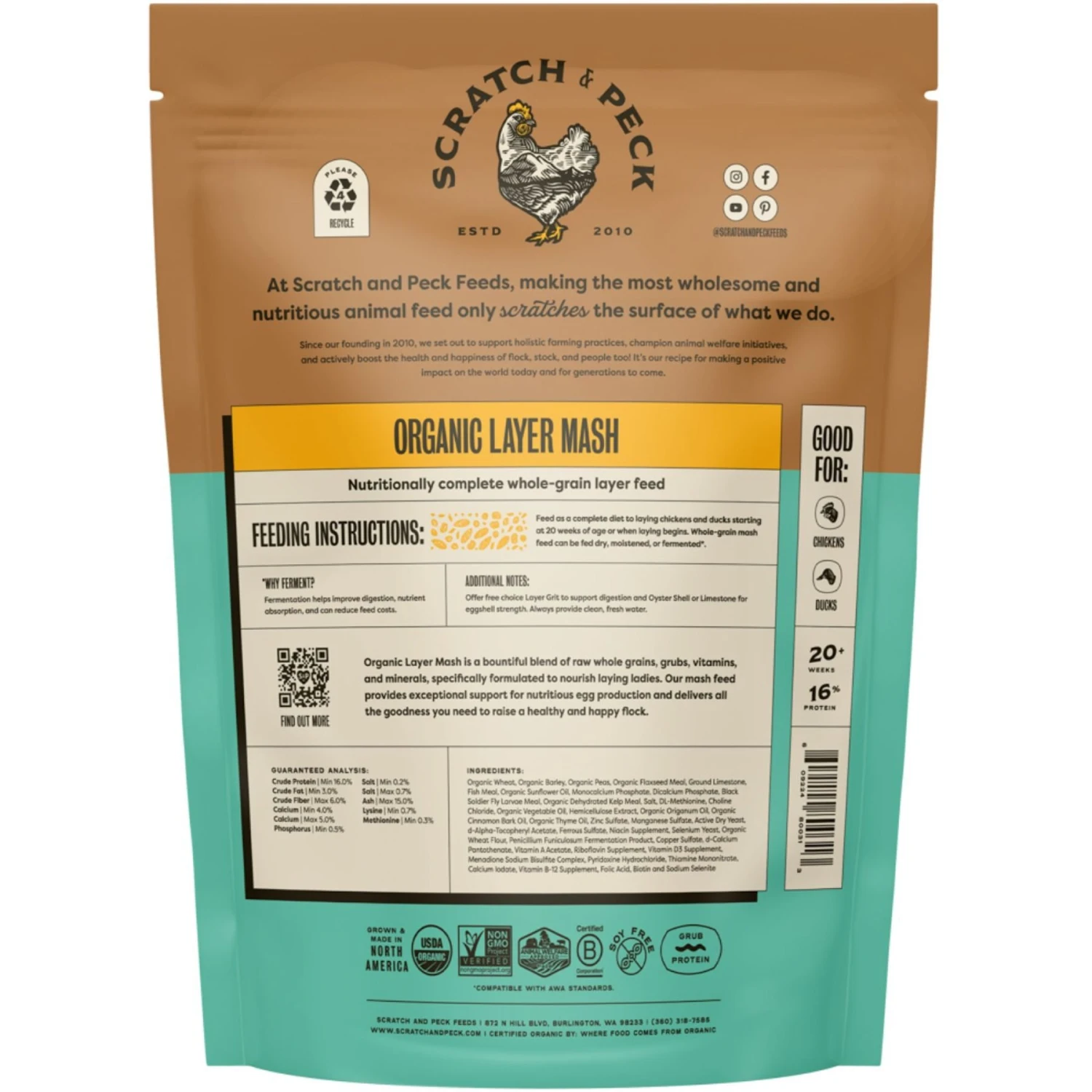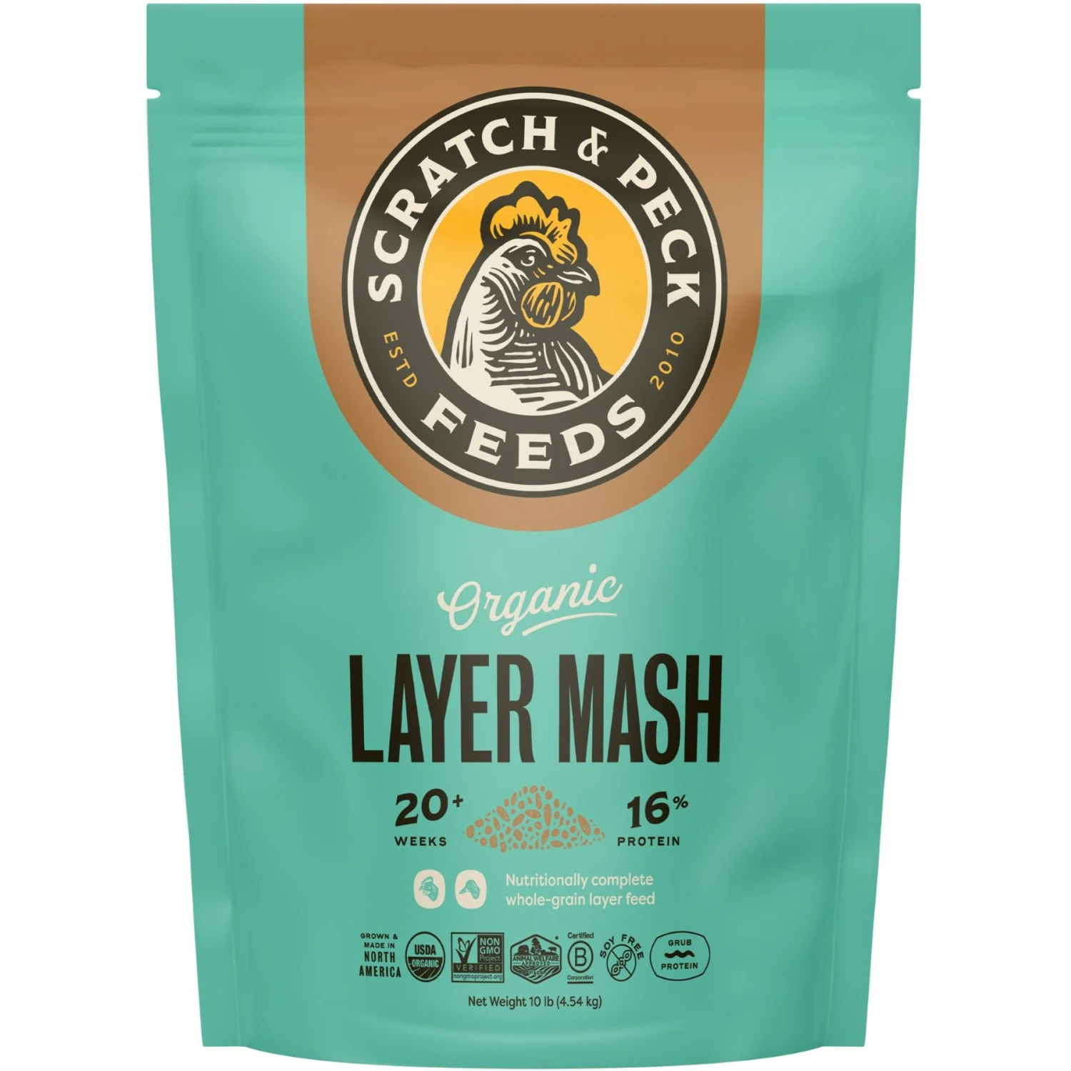 - This 16% protein mash feed is formulated with organic whole grains, grub protein, essential oils, vitamins and minerals to help your flock grow strong muscles, healthy bones and fluffy feathers.