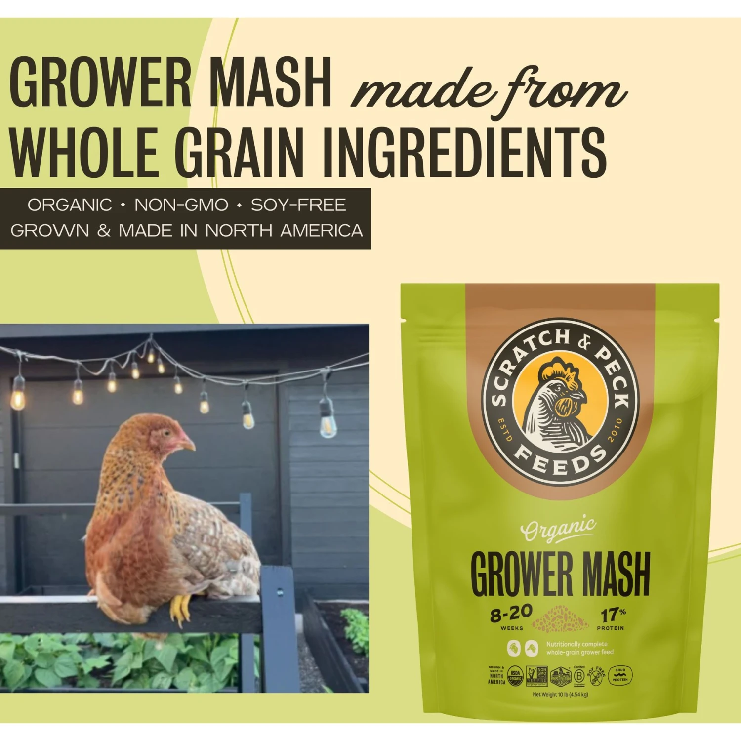 - Organic, non-GMO feed contains no corn or soy.